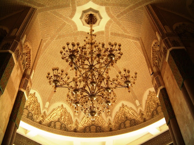 "INSIDE you'll see the gleaming newness and tremendous wealth in a stark contrast against the nearby quarters of Casablanca. Nearly all the materials of the Mosque are from Morocco, with the sole exceptions of the imported white granite columns and glass chandeliers, both from Italy. The marble is from Agadir, the cedar wood is from the Middle Atlas and the granite comes from Tafraoute. There is a huge women's gallery, which is beautifully carved of dark wood and the prayer area in the back is carpeted in red"